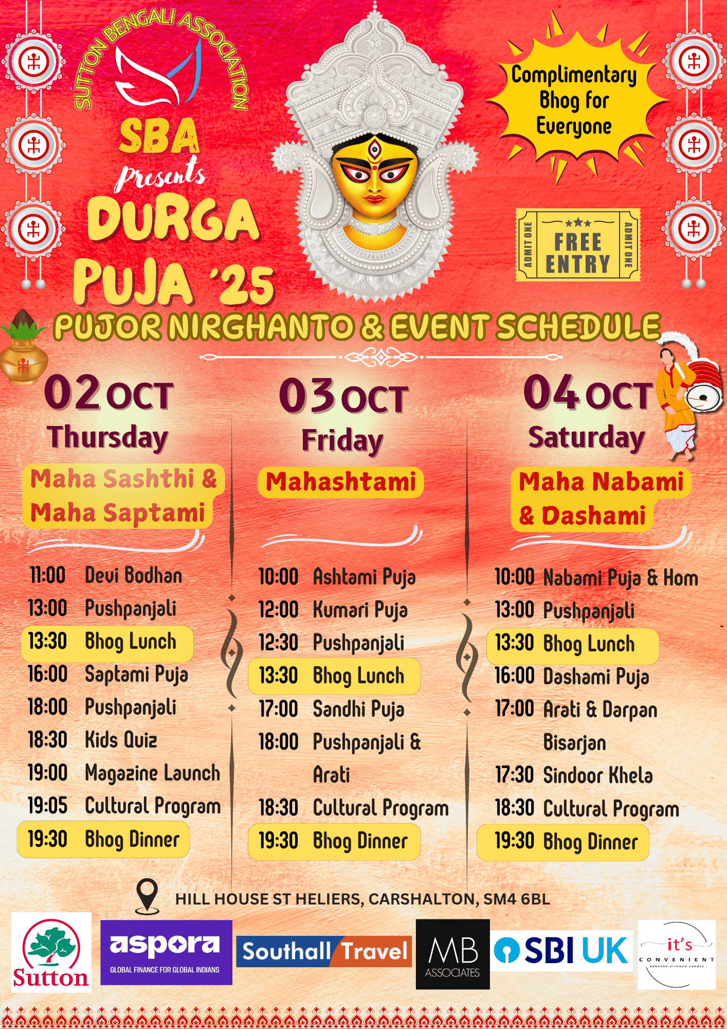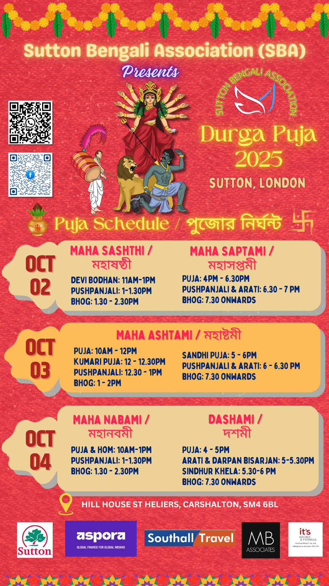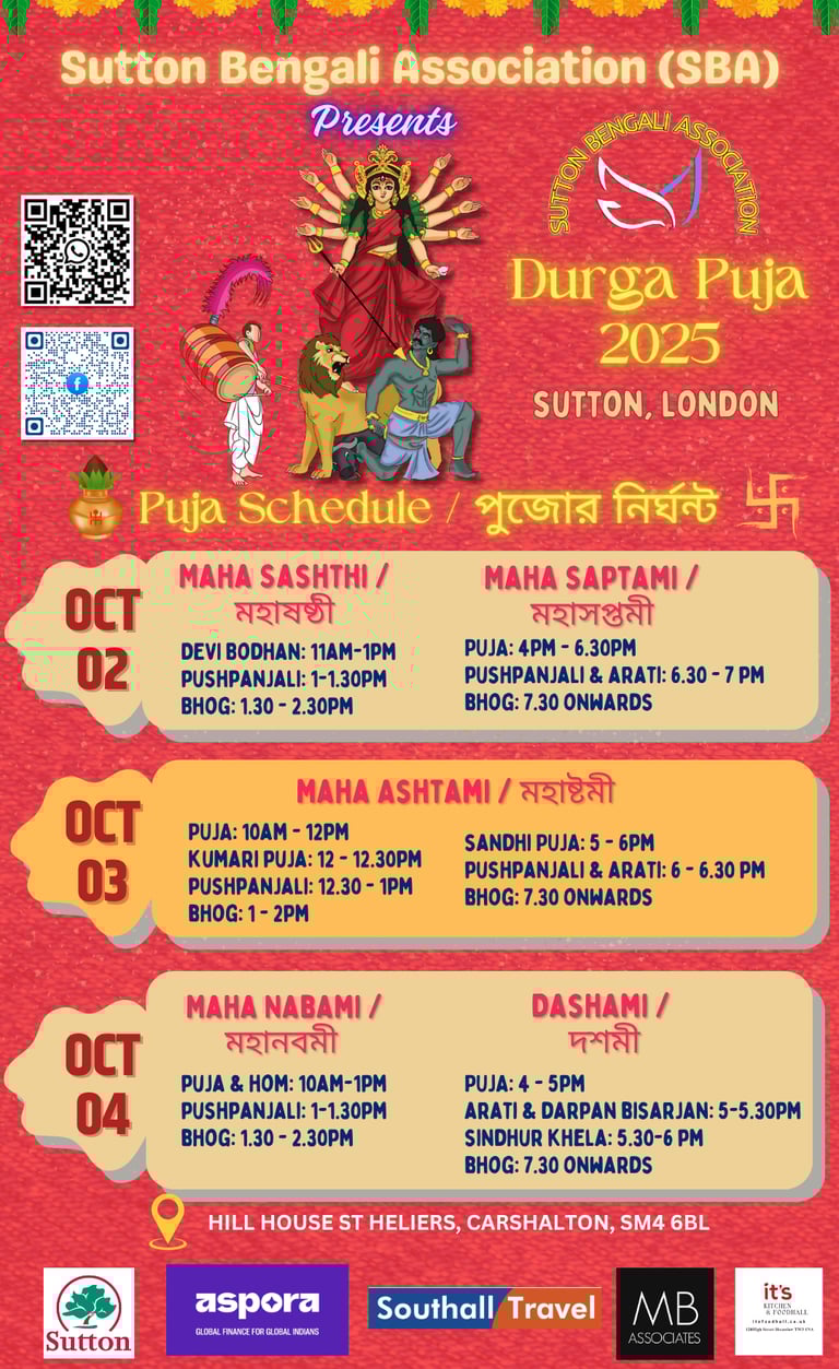 Durga Puja is the heart of our celebrations at Sutton Bengali Association – a time when devotion meets festivity, and the community comes alive with joy. In 2025, we invite you to join us in honouring Maa Durga with prayers, cultural performances, traditional food, and the vibrant spirit of Bengal. Together, let’s make this Durga Puja a memorable celebration of heritage, unity, and happiness.